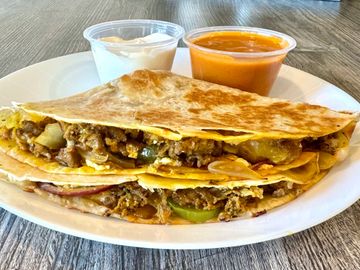 In a folded flour tortilla: our famous seasoned philly meat, grilled onions, grilled peppers, raw red onions, shredded cheese, feta cheese, blue cheese, and just a little bit of heat. Served with a side of sour cream and our house spicy sauce